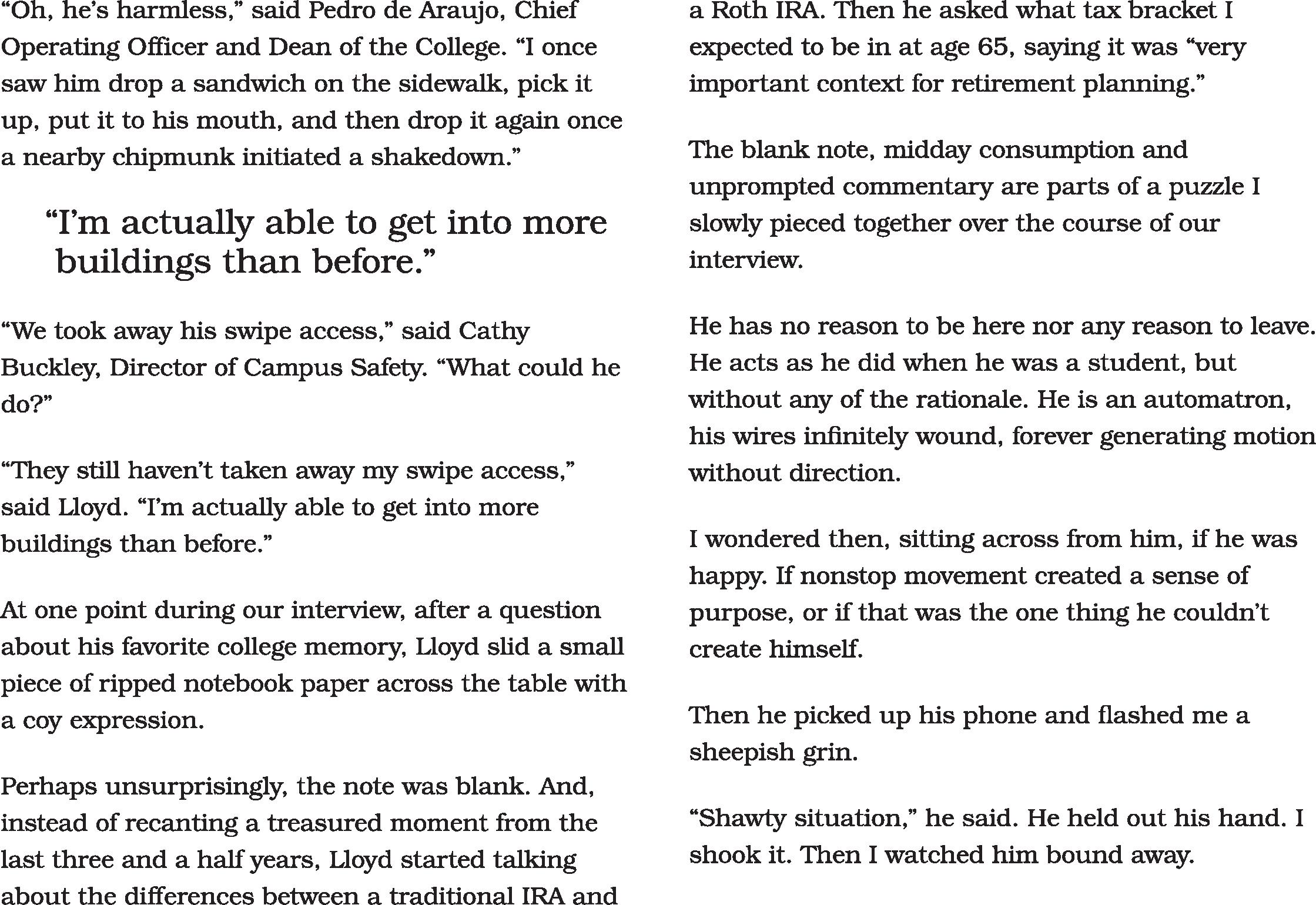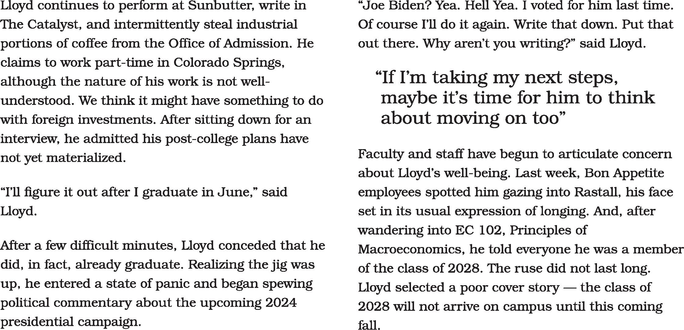 - By AnonymousGuest reporters from the Disincentive confirmed this week that Zeke Lloyd ‘23 is still on campus. Considering his recent graduation during the December ceremony, this comes as a surprise to many campus community members. According to dispatches from our reliable team of enhanced surveillance squirrels, Lloyd continues to participate in his usual array of unhinged activities, seemingly unaware that he is no longer a student. His presence puzzles faculty, staff, administrators and students.