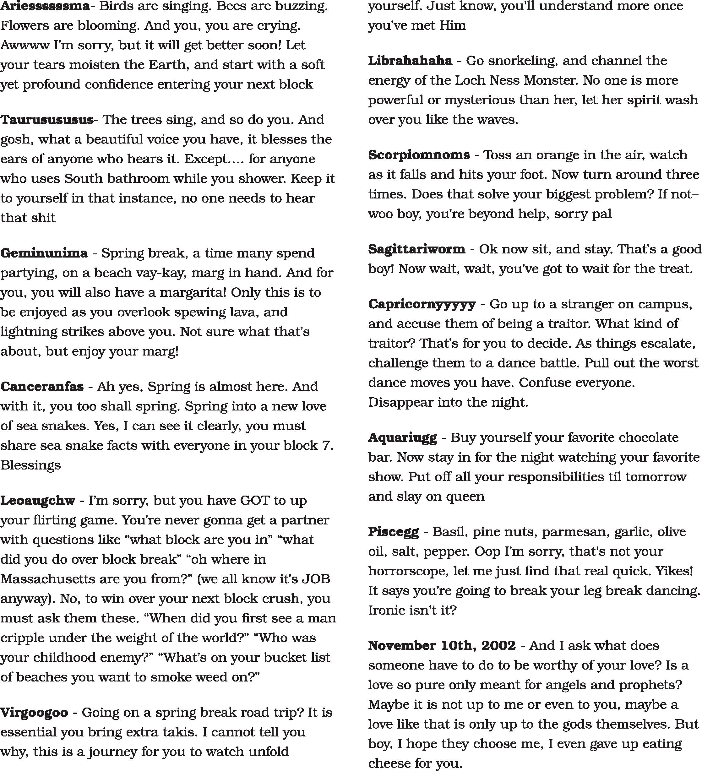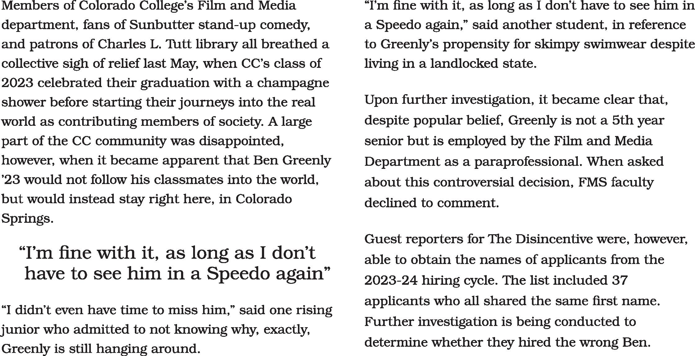 Thank you for once again joining us down here in the ditch of Colorado College. We pride ourselves on offering you the unregulated filth and cess you will only find here. In pace with all of the leadership changes happening both at CC and throughout the world, we have important and difficult information to share. None of us are leaving.