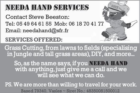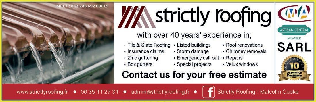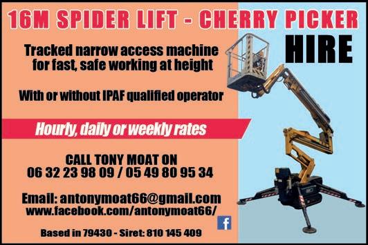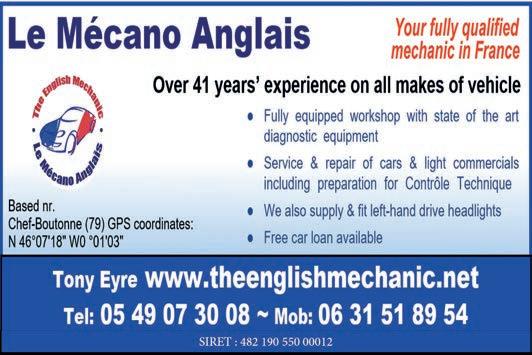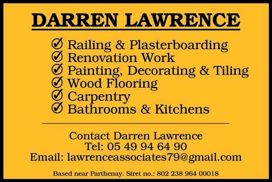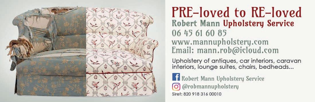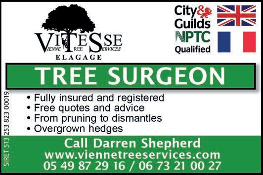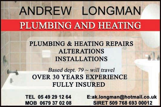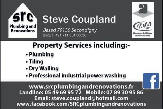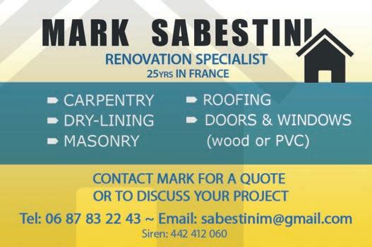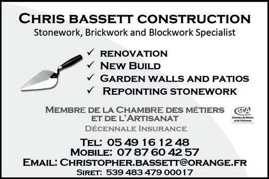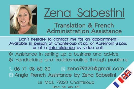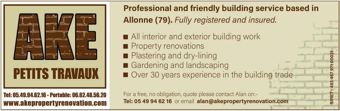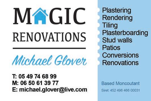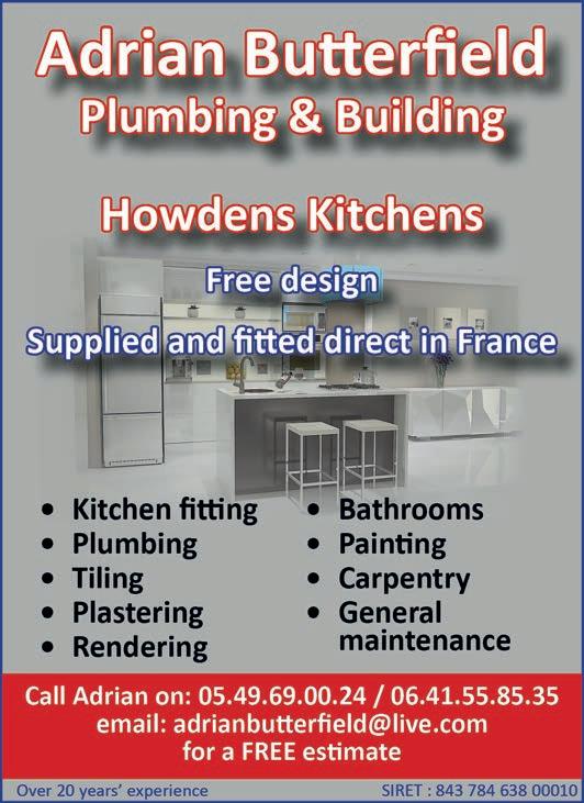 ABORDimmo 62 Adrian Butterfield (Handyman) 53 Affordable UK Designs (Kitchens & UPVC Double Glazing) 2 AKE Petits Travaux (Builder) 53 Alcoholics Anonymous 41 Alpacas & Glamping, Sanzay 4 Amanda Johnson - The Spectrum IFA Group 57 Andrew Longman (Plumbing & Heating) 54 ARB French Property 62 Assurances Maucourt (GAN Parthenay) 57 Beaux Villages Immobilier 63 Belle Fleur (Natural Insect Repellant & Moisturiser) 50 BH Assurances / Allianz - Isabelle Want 58 Blevins Franks Financial Management 60 Busy Bee (Cleaning Services) 40 Café Pause, l'Absie 8 CENTURY 21 (Immobilier) 2 Château de Saugé (Events, Tea Room, Accommodation) 6 Chateau Jarno Pepiniere 40 Cherry Picker Hire (Tony Moat) 55 Chez Christie’s Tea Rooms 6 Chloé Louise Moore (Hand Holder) 13 Chris Bassett Construction 53 Chris Parsons (Plumber/Heating Engineer) 54 Clean Sweep Chimney Services 54 Darren Lawrence 53 DPS Services (Gardener / Handyman) 40 Escoval 4 Franglais Deliveries (Transport & Removal Services) 21 Glendee Property Services 52 Hallmark Electricité 51 Harrison Hair (Mobile Hairdresser) 50 Hiley Location digger hire and groundworks 55 H & R Building Services 52 Irving Location - Digger Hire and Gravel deliveries 55 Jeff’s Metalwork 55 John Purchase - Mobile Mechanic 21 Keith Banks (Pool Services) 40 KJ Painting and decorating 54 KM Property Maintenance (Owen) 52 KM Services 79 (Cleaning & Gardening) 40 La Deuxieme Chance (Decorative paint specialists) 40 Le Café, Civray 6 Leggett Immobilier 61 Leggett (Property Management) 40 LPV Technology (IT services) 10 Magic Renovations (Michael Glover) 52 Mark Sabestini - Renovation and Construction 53 Maximilien Newman-Legros - Massage Therapies 50 Michael Moore (Electrician) 51 Michel Barateau (Cabinet maker) 51 Mike Sweeney - Motorsport Engineering 21 ML Computers 10 Needa Hand Services (Grass cutting etc.) 52 Paul Starsmeare (Mechanic) 21 Poitiers Biard Airport 9 RJC Pool Services 2 Rob Berry (Plasterer) 52 Robert Fletcher (RT Construction) 53 Robert Mann (Upholstery) 33 Simon the Tiler 54 Smart Moves - Removals & Storage 21 Stephen Shaw Painter 54 Steve Coupland (Plumbing and renovations) 52 Steve Robin (Plumbing, heating, electrics) 54 Strictly Roofing 56 Sue Burgess (French Classes & Translation) 13 Sunny Sky Cars 21 Susan Myall (Admin Support) 13 The English Mechanic & Son - Tony Eyre 21 The Fixer - Rick Denton 13 The French House Satellite TV 51 The Trading Post (International Food & Drink) 47 Tim Électricien 79 51 Tony Seeley Property Services 52 Val Assist (Translation Services) 13 Vienne Tree Services 40 Zena Sabestini (Translation Services) 13 dsm127-may22 v28 Online