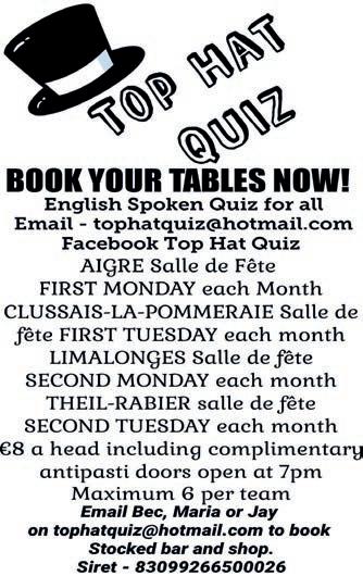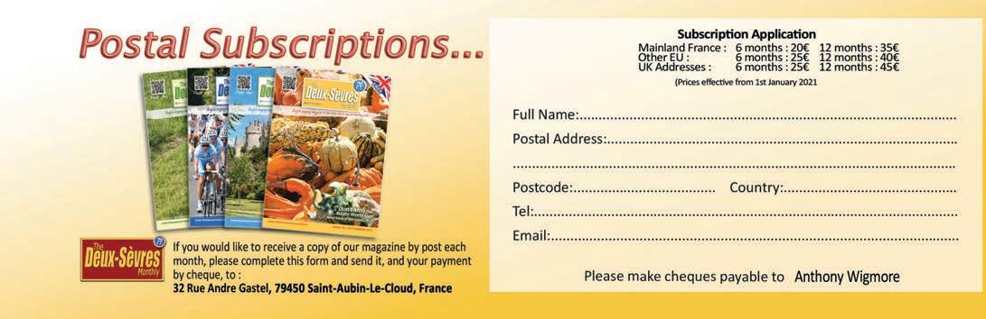 The Deux-Sèvres Monthly, May 2022 | 3 © Anthony and Lynda Wigmore 2022. All rights reserved. Material may not be reproduced without permission. While care is taken to ensure that articles and features are accurate, Anthony and Lynda Wigmore accept no liability for reader dissatisfaction. The opinions expressed and experiences shared are given by individual authors and do not necessarily represent the views or opinions of the publisher. Please ensure you verify that any company you are dealing with is a registered trading company in France and/or elsewhere. It is strongly advised to check details of published events with other sources before setting out on long journeys. <<The Deux-Sèvres Monthly>> est édité par Anthony and Lynda Wigmore 32 Rue Andre Gastel, 79450, Saint-Aubin-Le-Cloud Tél: 07 68 35 45 18. Directeur de la publication et rédacteur en chef: Anthony Wigmore. Crédits photos : Pixabay sauf mention contraire. Impression: Graficas Piquer SL, 29 Al Mediterraneo, Pol. Ind. San Rafael, 04230, Huércal de Almeria, Espagne. Dépôt légal: mai 2022 - Tirage: 4000 exemplaires. Siret: 830 076 345 00016 ISSN: 2115-4848
