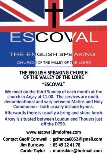 The English Speaking Church of the Valley of the Loire (ESCOVAL) meets at the R.C. Church in Arçay every 3rd Sunday of the month at 11am (just off the D759, Thouars to Loudun).