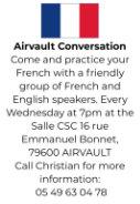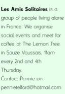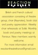 Reaction Poetry Group: Will be enjoying their summer break in July and August. Date and theme for September will be advertised in the next edition of DSM at : Café des Belles Fleurs, Fenioux