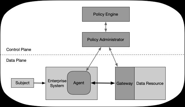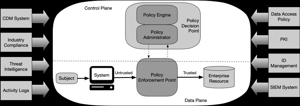 In the abstract model of access shown in Figure 1, a subject needs access to an enterprise resource. Access is granted through a policy decision point (PDP) and corresponding policy enforcement point (PEP). 3
