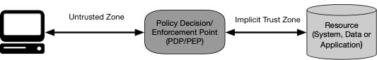 The PDP/PEP applies a set of controls so that all traffic beyond the PEP has a common level of trust. The PDP/PEP cannot apply additional policies beyond its location in the flow of traffic. To allow the PDP/PEP to be as specific as possible, the implicit trust zone must be as small as possible.