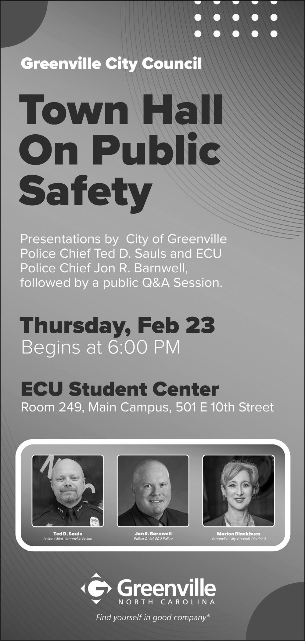 Today, the Greenville City Council will hold a town hall meeting on public safety. The meeting will take place from 6 to 8 p.m. in Room 249 of the Main Campus Student Center at East Carolina University.