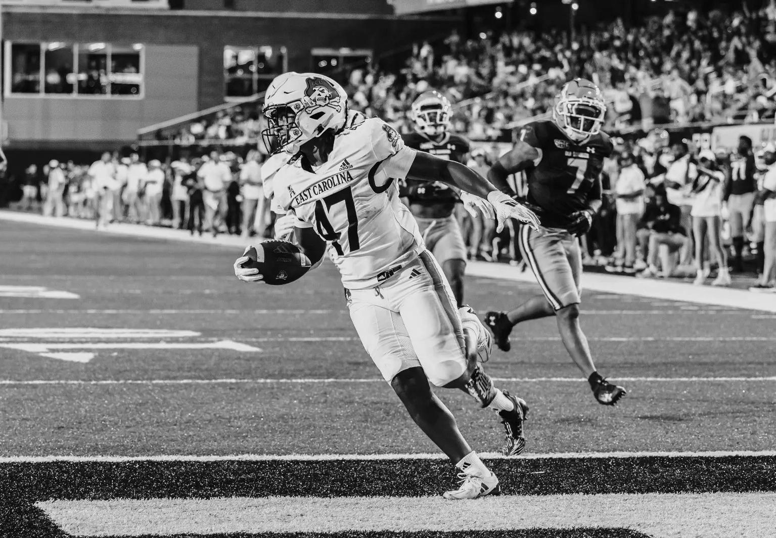 Graduate student star runningback RahJai Harris runs into the endzone for the touchdown against Old Dominion University, eventually leading to a win for the East Carolina University Pirates 20-14.