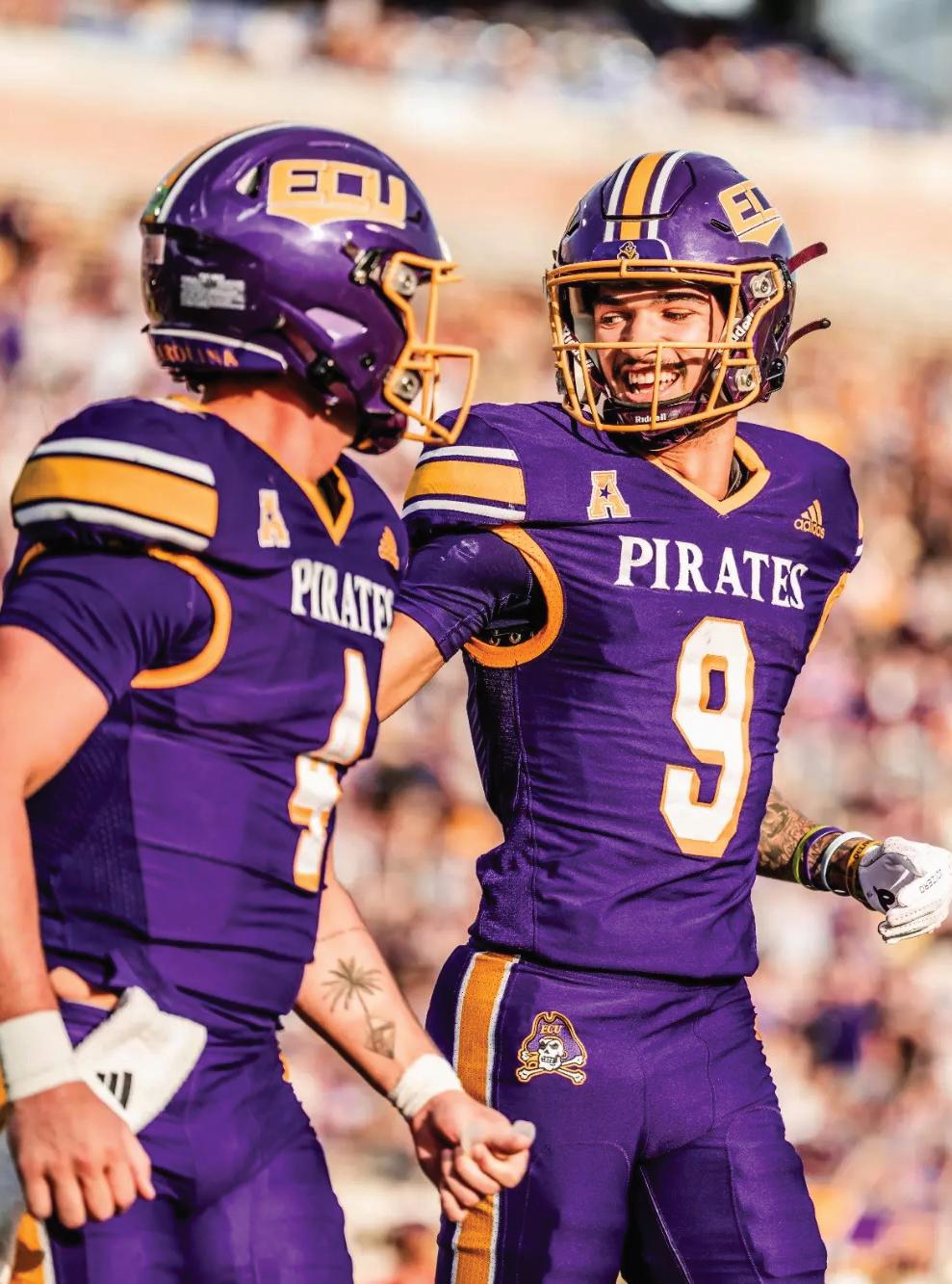 Two ECU football players standing and smiling on the field while at a home game at Dowdy.