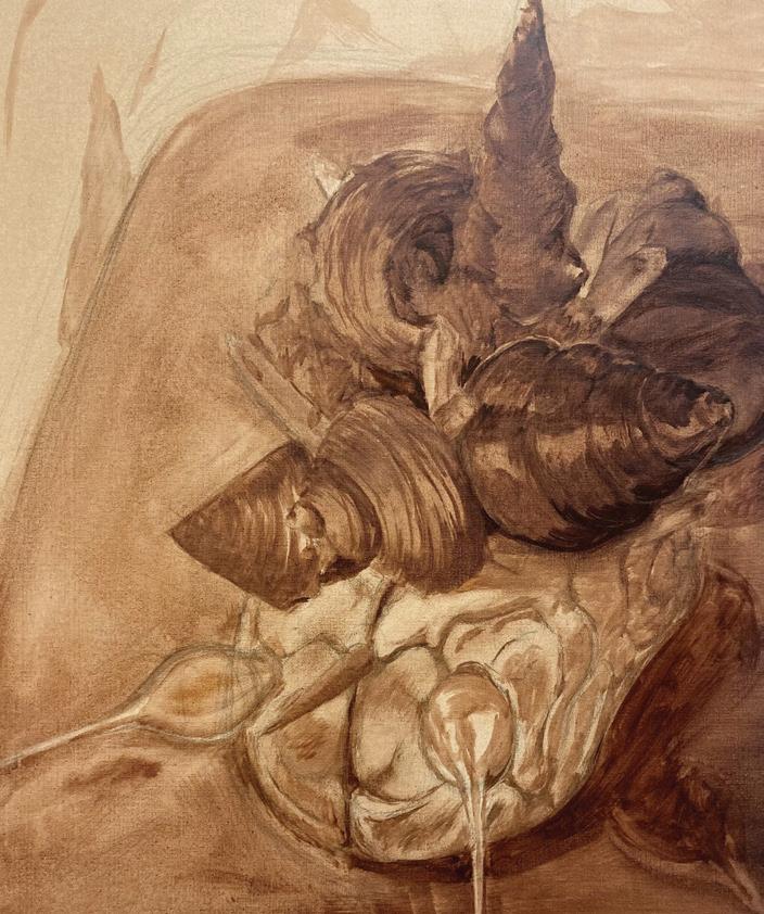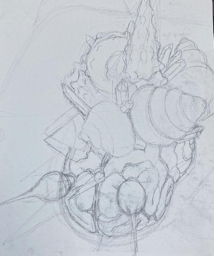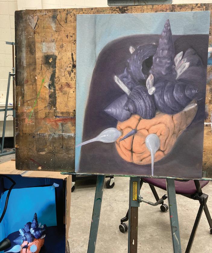 This painting was completed in April as my answer to the ‘threshold’ assignment in the 2561 Painting Composition studio. It is based on a photograph taken during spring break, while me and my friends were visiting the Museum of Natural History in downtown Raleigh. The location of the photo is an exhibit on prehistoric marine life in the shape of a tunnel. The tunnel then opens up to an exhibit on life during the most recent ice age.