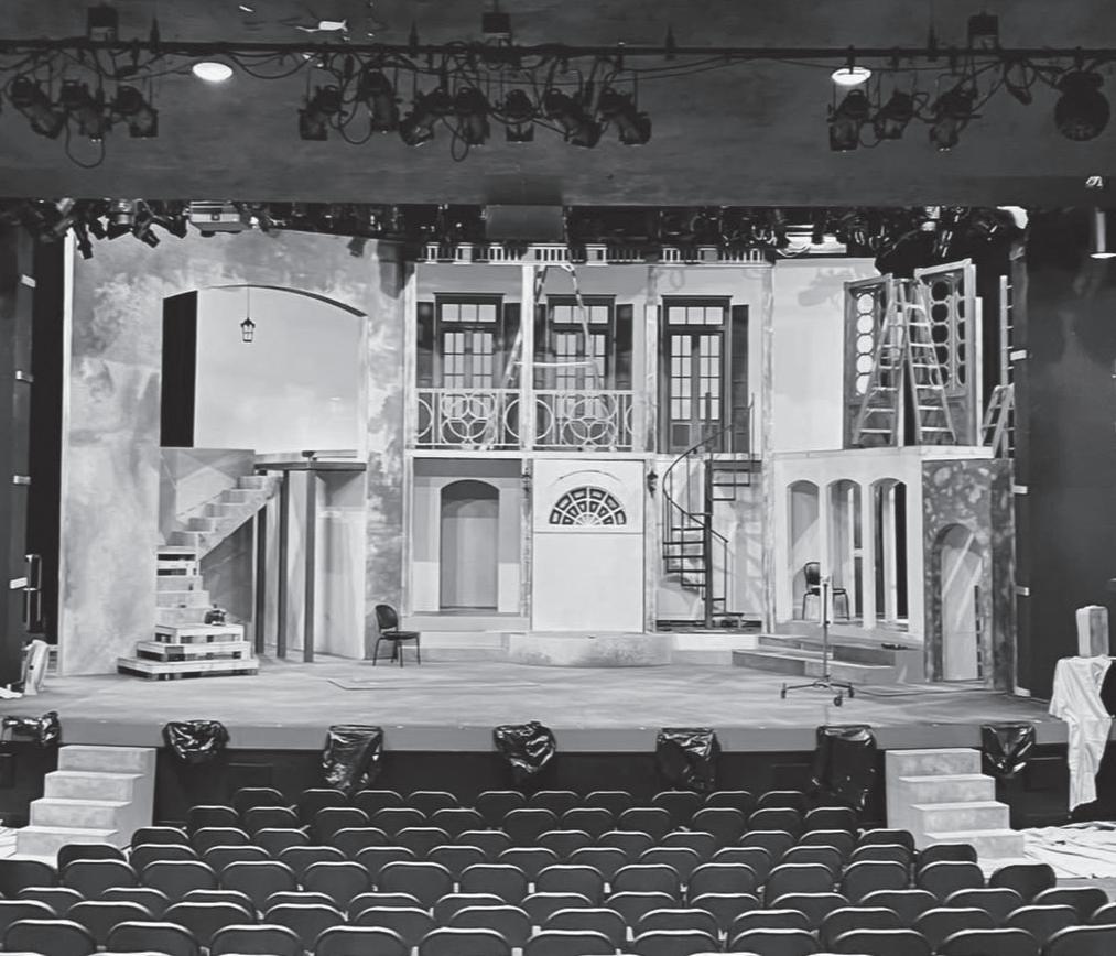 Wide shot of the stage set up finished by the school of theatre and dance located on stage in the McGinnis Auditorium ready for the musical’s first showing