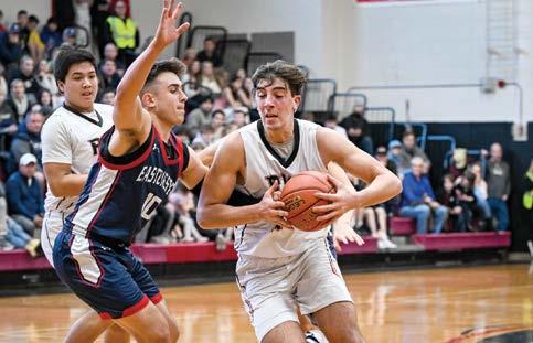 Jake Kessner drives to the hoop against Eastchester’s Frankie Provenzale in the first round of the Class A large-school playoffs on Feb. 18. Kessner scored 16 points to lead the Garnets to a 55-41 win. For story, see page 16. Photo/Mike Smith