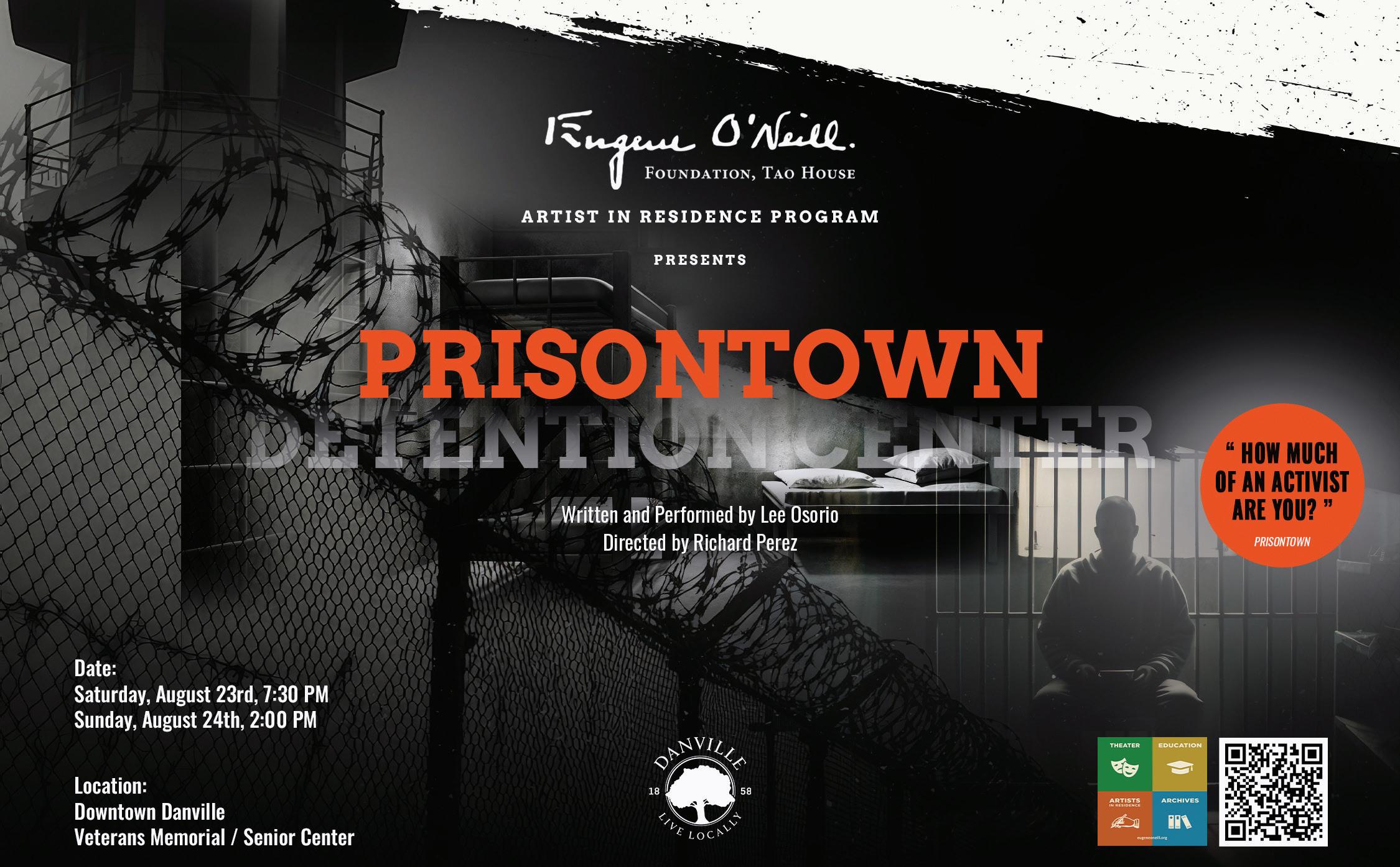 Who belongs and who doesn’t? These questions drive America’s most contentious debates about class, race, immigration, and gender. And in the one-person play Prisontown they force a young writer to confront his own complicated feelings about belonging and the need to bear witness to cruelty and injustice. Prisontown will be presented at the Veterans Memorial Hall/Senior Center in downtown Danville, Saturday, August 23rd at 7:30PM and Sunday, August 24th at 2PM .