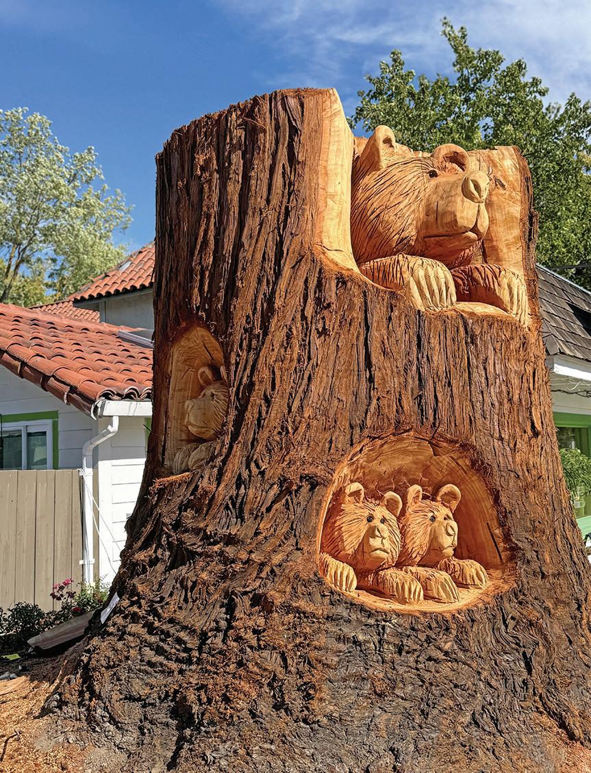 What is left of the redwood stump was recently carved to house a wooden bear family. Check out the new addition next time you drive through town.