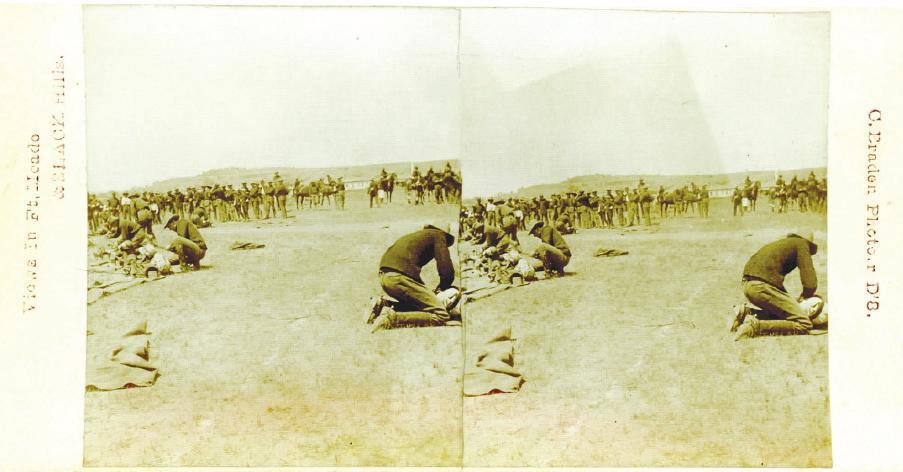 Initially, we were both tripped up by the photographers typed “signature.” It appeared to read “C. Eraden Photo.r D’8.” On sites like ancestry.com, the last name of “Eraden” exists, but is not super common, something wasn’t adding up. That was until I looked again at the typed caption “BLACK Hills.” It was here I had my epiphany. Having typed many a school term paper on an actual typewriter, the typewriter ribbon can wear out. I noticed a faintness on the first letter of the photographers last name. It wasn’t “Eraden,” comparing the capital “B” in “BLACK Hills” I discovered the “E” in the last name was actually a “B.” That opened the floodgates to finding our photographer, Charles C. Braden. A search on familysearch.org pulled up an index card from the Veterans Administration that showed Charles C. Braden was a “Saddler” of the cavalry between 1895 and 1898. Best of all, the card showed he was a member of Troop D of the 8th Cavalary (hence the r. D’8 after his name). Bingo! We had our guy!
