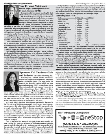 Food Serving Size Added Sugar Angel food cake 4 oz piece 7 tsp Banana cake 4 oz piece 2 tsp Brownie, no icing 1 oz piece 4 tsp Cheesecake 4 oz piece 2 tsp Chocolate cake, iced 4 oz piece 10 tsp Chocolate chip cookie 1 cookie 2 tsp Coffee cake 4 oz piece 5 tsp Cupcake, iced 4 oz piece 6 tsp Fig Newtons 2 cookies 2 tsp Gingersnaps 1 cookie 3 tsp Glazed doughnut 1 doughnut 4 tsp Oatmeal cookie 1 cookie 2 tsp Chocolate candy bar 1 bar 4.5 tsp Chocolate mint 1 piece 2 tsp from Sparkspeople website 2015 Clients often ask, “How does a high sugar intake affect them other than weight gain and possible diabetes?” People don’t realize that sugar can also feed yeast, fungi, and detrimental bacteria in your gut which can cause bloating and gas. Symptoms such as joint pain, headaches, fatigue, inability to lose weight, and constant sugar cravings can often be decreased with a lower sugar intake. If you feel you are having a difficult time controlling your cravings for sugar, which is not helping your weight loss efforts, help your yourself by allowing me to set up a food plan that will work with your life. It is perfectly fine to have sugar in your day as long as it is eaten in a balanced way. I am glad to inform you that insurance companies such as Aetna, Sutter, Health Net, ABMG, and Hill Physicians will cover nutritional counseling. Please visit LindaRD.com for the list of all insurance companies, past articles and information on nutrition. Call me at (925) 855-0150 or email me at lifeweight1@gmail.com. Advertorial return even after being surgically removed. Also, the surgeon may refer the patient for radiation if the tumor could not be fully excised. To answer my patient’s question, her skin cancer was most likely caused by her history of sun exposure, rather than the use of Retin-A cream. Retin-A contains retinoids, which are derivatives of Vitamin A often used in anti-aging creams to help promote skin renewal. In fact, retinoids that are taken orally can decrease the risk of SCC of the skin in certain high-risk populations. However, retinoids in topical form have not been shown to reduce skin cancer risk. But remember that when you use Retin-A and other topical retinoids, your skin is more susceptible to ultraviolet light. If you use these products, take special care to avoid sun exposure and use sunscreen. Dr. Chung is a Radiation Oncologist with Diablo Valley Oncology & Hematology Medical Group. She sees patients in Pleasant Hill and Berkeley and can be reached at 925-825-8878. Attend an educational program on May 20th, 6:30-8pm at the Walnut Creek Library’s Oak Room. “The Many Faces of Skin Cancer” will feature a panel of medical experts who will discuss the most current information regarding prevention, early detection, risk factors, treatment options. To register call 925-677-5041. Advertorial