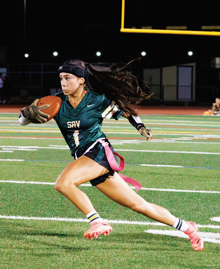 In 2022, San Ramon Valley High School (SRVHS) teacher and technology teacher on special assignment (TSA), Chad Cochran, proposed to the SRVHS athletic director that they consider adding girls’ flag football to their fall sport offerings. He had been following the approval process moving through the state and wanted SRVHS to be one of the first to offer the sport when approved by the California Interscholastic Federation (CIF). He had coached his son’s flag football team for years. For his sports-interested daughter, he saw how high school flag football was growing in popularity in Southern California and elsewhere in the country, as well as the growth of college programs. Joined by parent Sean Gann, whose daughter Sydney Gann is a varsity player and team captain this year, the coaches began growing the team and building a competitive pipeline of underclassmen as well to eventually field both junior varsity and varsity teams.
