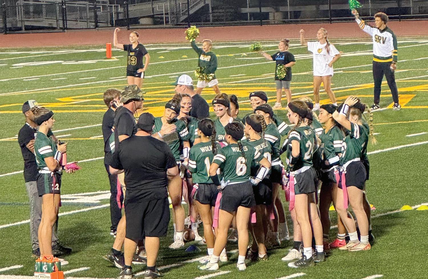 SRVHS Wolves varsity girls’ flag football team huddles during halftime at their game against Liberty on September 4, 2024.
