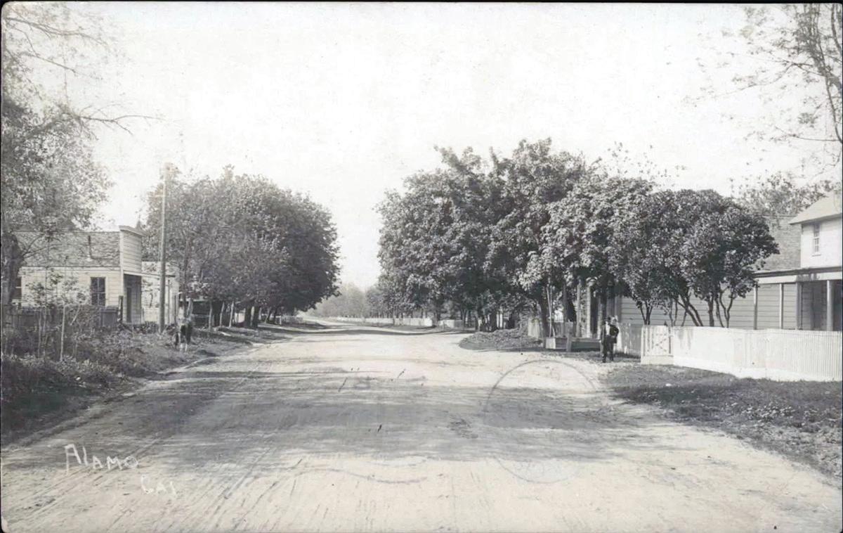 I recently won an eBay auction for two Alamo postcards with images I had never seen before. The pictures are labeled “ALAMO CAL.” I believe they were taken in the early 1900s. The two images (at right) appear to be what is now known as Danville Boulevard and was then just known as the “County Road.” The picture appears to be looking north as the telephone poles are on the left hand side, and showing an area probably between what is now known as Las Trampas Rd. (formerly North Ave.) and Stone Valley Rd.