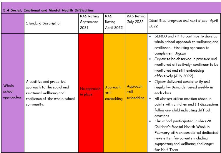 In addition, the previous successes in SEMH continue to be built upon to develop our provision across the school to ensure the remaining strands are naturally embedded into our day-to-day practice.