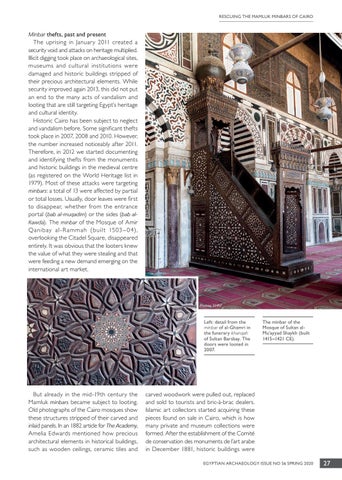 The uprising in January 2011 created a security void and attacks on heritage multiplied. Illicit digging took place on archaeological sites, museums and cultural institutions were damaged and historic buildings stripped of their precious architectural elements. While security improved again 2013, this did not put an end to the many acts of vandalism and looting that are still targeting Egypt’s heritage and cultural identity. Historic Cairo has been subject to neglect and vandalism before. Some significant thefts took place in 2007, 2008 and 2010. However, the number increased noticeably after 2011. Therefore, in 2012 we started documenting and identifying thefts from the monuments and historic buildings in the medieval centre (as registered on the World Heritage list in 1979). Most of these attacks were targeting minbars: a total of 13 were affected by partial or total losses. Usually, door leaves were first to disappear, whether from the entrance portal (bab al-muqadim) or the sides (bab alRawda). The minbar of the Mosque of Amir Qanibay al- R ammah (built 1503 – 0 4), overlooking the Citadel Square, disappeared entirely. It was obvious that the looters knew the value of what they were stealing and that were feeding a new demand emerging on the international art market.