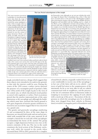 The Late Period redevelopment of the temple the Ramesside court, although we are not sure whether this work was begun by Amasis. Here a foundation box, c.65m × 40m, had been excavated down to the level of the Old Kingdom podium (thus removing the remains of the temples of the Middle and New Kingdoms) and back-filled with fine building sand to a depth of 2m. Above, a new configuration of rooms and corridors was constructed, with walls of quartzite and columns of basalt. This part of the complex was so horribly destroyed in the Middle Ages that we despaired of ever being able to reconstruct the ground plan. The present surface layer consists of masses of shattered quartzite, some few fragments approaching 1m in length, but most reduced to mere slivers of stone. But then, as we proceeded to excavate in incremental ‘peel-backs’, we found a series of regularly-positioned ‘slots’ which were appearing beneath the rubble, sunk into the foundation sand; and it was realised that here we had the foundations of a wallingsystem, robbed out to be sure, but accidentally back-filled by detritus. Once these had been plotted, both in top-plan and section, there emerged a meaningful and symmetrical plan, not so very different from the layout of typical temples of the Late Period. A barque shrine had occupied the central portion of the rear of the temple, and had been surrounded by an ambulatory and side chambers on south, east and west.What lay in front has not yet been fully investigated, but it is conceivable that a hypostyle hall had once stood behind the second Ramesside pylon. Decoration of these new chambers dated from the Twenty-Ninth and Thirtieth Dynasties: a dado of upright cartouches gives the prenomen and nomen of Akoris of the Twenty-Ninth Dynasty, while a horizontal band of text (of unknown import) was added by King Nekhtnebef (Nektanebo I) in his first year (380-79 BC). The walls were carved with the usual scenes in panels, showing the king offering Dado of cartouches of king Akoris, from an ambulatory(?) within the temple to the Ram.