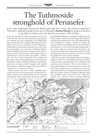The Tuthmoside stronghold of Perunefer In the early Eighteenth Dynasty the Tuthmoside kings had a naval and military stronghold at ‘Perunefer’, originally thought to have been at Memphis. Manfred Bietak reconsiders its location in the light of evidence from the Austrian excavations at Tell el-Daba. It was George Daressy who first proposed in the late 1920s that the location of Perunefer, the major Egyptian military and naval stronghold of the Eighteenth Dynasty, should not be sought at Memphis but in the Delta, at the same site as the later town of Piramesse. Labib Habachi agreed that Perunefer was in the Delta but he thought it was at the site of Khatana/Qantir which he identified as Avaris/Piramesse.Their reasoning was based on the Karnak and Memphis stelae of Amenhotep II, who describes proceeding to Memphis, after his arrival at Perunefer. This would have been unnecessary if Perunefer had been situated at the Memphite residence. A Delta identification would also make sense in respect to the Canaanite cults attested for Perunefer in Pap. Petersburg 1116A: they could be considered as a continuum of Avaris. Ancient Avaris can now be safely identified, after nearly four decades of excavations by the Austrian Institute, with the site of Tell el-Daba and its environs, and together with nearby Qantir (being excavated by