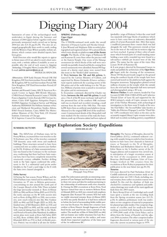 Digging Diary 2004 Summaries of some of the archaeological work undertaken in Egypt during the Summer and Autumn of 2004 appear below together with some previously unreported work carried out in Spring 2004 (see also EA 25, pp.25-29). The sites are arranged geographically from north to south, ending with the Western Oases.Where possible, website addresses, which contain more detailed reports, have been given. Field Directors who would like reports to appear in future issues of EA are asked to send a short summary, with a website address if available, as soon as possible after the end of each season to Egyptian Archaeology, 3 Doughty Mews, London WC1N 2PG. E-mail: patricia.spencer@ees.ac.uk PATRICIA SPENCER Abbreviations: EDP Early Dynastic Period: OK Old Kingdom; FIP First Intermediate Period; MK Middle Kingdom; SIP Second Intermediate Period; NK New Kingdom;TIP Third Intermediate Period; LP Late Period. Institutes and Research Centres: ARCE American Research Center in Egypt; BM British Museum; CNRS French National Research Centre; CTEEFK Franco-Egyptian Centre, Karnak; DAI German Institute, Cairo; EAP Egyptian Antiquities Project; EGSMA Egyptian Geological Survey and Mining Authority; HIAMASA The Hellenic Institute of Ancient and Mediaeval Alexandrian Studies, Athens; IFAO French Institute, Cairo; MMA The Metropolitan Museum of Art, New York; OI Oriental Institute, University of Chicago. SCA Supreme Council for Antiquities