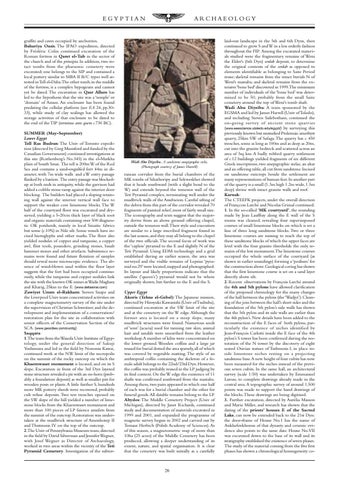 laid-out landscape in the 5th and 6th Dyns, then continued to grow S and W in a less orderly fashion throughout the FIP. Among the excavated materials studied were the fragmentary remains of Weni the Elder's (6th Dyn) serdab deposit, to determine the original contents of the serdab as opposed to elements identifiable as belonging to Saite Period reuse; skeletal remains from the intact burials N of Weni's mastaba; and skeletal remains from the extensive 'bone bed' discovered in 1999.The minimum number of individuals of the ‘bone bed’ was determined to be 50, probably from the small Saite cemetery around the top of Weni's tomb shaft. Wadi Abu Diyeiba: A team sponsored by the EGSMA and led by James Harrell (Univ of Toledo), and including Steven Sidebotham, continued the on-going survey of ancient stone quarr ies (www.eeescience.utoledo.edu/egypt/) by surveying this previously known but unstudied Ptolemaic amethyst quarry, 25km SW of Safaga. The quarry has c. 450 trenches, some as long as 100m and as deep as 20m, cut into the granite bedrock and scattered across an area of 3sq km. A badly robbed quarry settlement of c.12 buildings yielded fragments of six different Greek inscriptions, two anepigraphic stelae, an altar and an offering table, all cut from sandstone. Incised on sandstone outcrops beside the settlement are many representations of human feet. In another part of the quarry is a small (1.3m high 1.2m wide, 1.5m deep) shrine with intact granite walls and roof. Karnak: The CTEEFK projects, under the overall direction of Françcois Larché and Nicolas Grimal continued. 1. In the so-called ‘MK courtyard’, the sounding made by Jean Lauffray along the E wall of the S rooms was cleaned, revealing four superimposed courses of small limestone blocks on which is set a line of three long sandstone blocks. Two or three limestone courses are missing to reach the top of these sandstone blocks of which the upper faces are level with the four granite thresholds: the only remains of the lost monument.The limestone courses occupied the whole surface of the courtyard (as shown in earlier soundings) forming a ‘podium’ for the construction above. Geological coring has shown that the first limestone course is set on a sand layer directly above silt. 2. Recent observations by François Larché around the 4th and 5th pylons have allowed clarification of the proposed chronology for the many changes of the hall between the pylons (the ‘Wadjyt’). Cleaning of the join between the hall’s short sides and the foundation of the 5th pylon’s side walls has shown that the 5th pylon and its side walls are earlier than the 4th pylon’s. New details have been added to the reconstruction of the E faces of both pylons, particularly the existence of niches identified by Jean-François Carlotti inside the E face of the 4th pylon’s S tower has been confirmed during the restoration of the N tower by the discovery of eight seated Osirian statues of Tuthmosis I, in place inside limestone niches resting on a projecting sandstone base. A new height of four cubits has now been measured for the niches instead of the previous seven cubits. In the same hall, an architectural survey (scale 1:50) was undertaken by Emmanuel Laroze, to complete drawings already made in the central area. A topographic survey of around 1,500 points was made to support the hand drawings of the blocks.These drawings are being digitised. 3. Further excavation, directed by Aurélia Masson and Marie Millet, and research has shown that the dating of the priests’ houses E of the Sacred Lake, can now be extended back to the 21st Dyn: the door-frame of House No.1 has the name of Ankhefenkhonsu of that dynasty and ceramic evidence also points to the same date. House No.VII was excavated down to the base of its wall and its stratigraphy established the existence of seven phases. The study of the material coming from the five first phases has shown a chronological homogeneity: ce-
