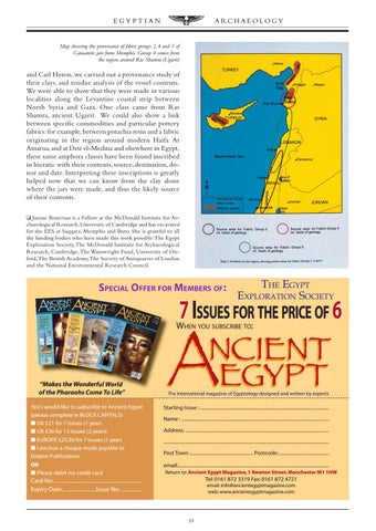 and Carl Heron, we carried out a provenance study of their clays, and residue analysis of the vessel contents. We were able to show that they were made in various localities along the Levantine coastal strip between North Syria and Gaza. One class came from Ras Shamra, ancient Ugarit. We could also show a link between specific commodities and particular pottery fabrics: for example, between pistachia resin and a fabric originating in the region around modern Haifa. At Amarna, and at Deir el-Medina and elsewhere in Egypt, these same amphora classes have been found inscribed in hieratic with their contents, source, destination, donor and date. Interpreting these inscriptions is greatly helped now that we can know from the clay alone where the jars were made, and thus the likely source of their contents. ❑ Janine Bourriau is a Fellow at the McDonald Institute for Archaeological Research, University of Cambridge and has excavated for the EES at Saqqara, Memphis and Buto. She is grateful to all the funding bodies who have made this work possible: The Egypt Exploration Society, The McDonald Institute for Archaeological Research, Cambridge, The Wainwright Fund, University of Oxford, The British Academy, The Society of Antiquaries of London and the National Environmental Research Council.