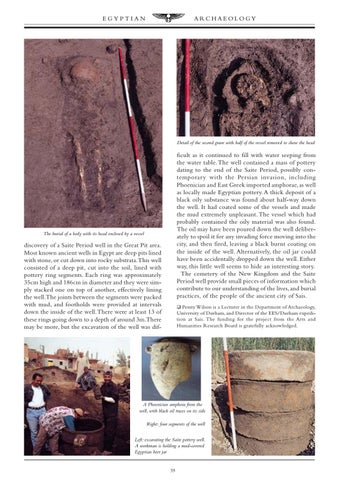 discovery of a Saite Period well in the Great Pit area. Most known ancient wells in Egypt are deep pits lined with stone, or cut down into rocky substrata. This well consisted of a deep pit, cut into the soil, lined with pottery ring segments. Each ring was approximately 35cm high and 186cm in diameter and they were simply stacked one on top of another, effectively lining the well.The joints between the segments were packed with mud, and footholds were provided at intervals down the inside of the well. There were at least 13 of these rings going down to a depth of around 3m.There may be more, but the excavation of the well was dif-