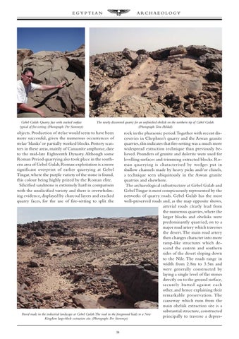 rock in the pharaonic period.Together with recent discoveries in Chephren’s quarry and the Aswan granite quarries, this indicates that fire-setting was a much more widespread extraction technique than previously believed. Pounders of granite and dolerite were used for levelling surfaces and trimming extracted blocks. Roman quarrying is characterised by wedges put in shallow channels made by heavy picks and/or chisels, a technique seen ubiquitously in the Aswan granite quarries and elsewhere. The archaeological infrastructure at Gebel Gulab and Gebel Tingar is most conspicuously represented by the networks of quarry roads. Gebel Gulab has the most well-preserved roads and, as the map opposite shows, arterial roads clearly lead from the numerous quarries, where the larger blocks and obelisks were predominantly quarried, on to a major road artery which traverses the desert. The main road artery then changes character into more ramp-like structures which descend the eastern and southern sides of the desert sloping down to the Nile. The roads range in width from 2.8m to 3.5m and were generally constructed by laying a single level of flat stones directly on to the ground surface, securely butted against each other, and hence explaining their remarkable preservation. The causeway which runs from the main obelisk extraction site is a substantial structure, constructed Paved roads in the industrial landscape at Gebel Gulab. The road in the foreground leads to a New principally to traverse a depresKingdom large-block extraction site. (Photograph: Per Storemyr) 38