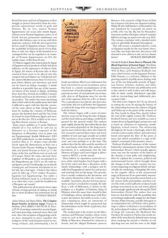 flected the piety and fear of Egyptians in their struggle to protect themselves from the everpresent supernormal world of gods and demons. By its ver y nature, Roman Egyptomania can occur only outside Egypt, whereas most Roman Egyptians, native or of Greek descent, permanent inhabitants, not seekers after fashion, came to terms with their desperate existence with the aid of protective devices made by Egyptian artisans. Owing to the availability of material, much of it in Italy, there is only one object of the hundred or so catalogued that can be regarded as an example of Roman Egyptomania: no.103, the marble statue of Bes from Rome. Dr Ashton suggests that importation by Egypt of Egyptomaniacal products of Italy had great influence on the appearance of objects made in Egypt. Isis statues of Roman date in their canonical form seem to be placed into this category, but such figures are widespread over the eastern Mediterranean, from Cyrene, Cyprus, Delos, Athens and elsewhere, and need not be based on Italian examples. I doubt whether it is provable that any of the canonical statues of Isis found in Egypt, including those from Ras el-Soda (in marble), Canopus (in basalt) and Luxor (in limestone), is an Italian product. The author has many interesting ideas which enliven this publication, but I find it difficult to agree with her that the canonical Isis came about in Italy during Roman times by stealing the costume of Ptolemaic queens: the knotted shawl and the ‘Isis’ locks are found on many Ptolemaic figures and vases, just as the Bes (no. 59) is as likely to be wearing Macedonian armour as Roman. Some minor quibbles: p. 9: surely Hadrian’s rebuild (if it was indeed he and not an Antonine or a Severan emperor) of the Sarapieion at Alexandria, even in parts, was not Egyptianising? (Judith McKenzie’s 2003 and 2004 publications on this building have resolved this); p. 11: despite some possible Greek input the Ammoneion at Siwa was a Twenty-Sixth Dynasty building in Egyptian style, not ‘purely Roman in form’; p. 11: the Gates of the Sun and Moon were at each end of Canopic Street, the main east-west thoroughfare of Alexandria, not incorporated in the Hippodrome; pp. 132-9: no. 84, with inept figures carved, I would judge, on an already existing pot, and nonsense inscriptions in relief (the last a bad sign) - I believe this object must be false; pp. 176-9: neither ‘RomanoEgyptian nor Egyptianising’, but rather a Roman barbarian, made in a coloured stone as so often they were: could the headdress be a Phrygian cap variant? This publication for all its merits shows signs of hasty writing and lack of editing, no doubt due to short deadlines, but unfortunate for all that. DONALD BAILEY Aidan Dodson and Dyan Hilton, The Complete Royal Families of Ancient Egypt. Thames & Hudson, 2004. (ISBN 0 500 05128 3). Price: £29.95. Genealogy mattered in ancient Egypt, and royal genealogy mattered most, then and now. Since the inception of Egyptology, scholars have attempted to piece together the pedigrees of the royal dynasties based on surviving evidence, and, unfortunately, a lot of