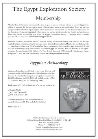 Egyptian Archaeology Egyptian Archaeology is published twice a year (Spring and Autumn) and is included in the EES Membership subscription for all Membership categories, except that of Associates. EES Membership for 2005-2006 will include receipt of EA 27 (Autumn 2005) and EA 28 (Spring 2006). Back issues 3-25 (1-2 are both out of print) are available at: £3 each (No.3) £3.95 each (Nos.4-13) £4.95 each (Nos.14-25) An index to issues 1-10 is included with No.11 An index to issues 11-20 is included with No.21 ISSN 0962 2837