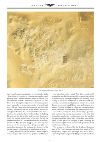 were identified and recorded. As a direct result, a 3D map of the site has been compiled, with all the surface traces including tomb ground plans and masonry (consisting of limestone and bricks of both mud and tafl), dumps, concentrations of ceramics, human and animal bones, pockets of wind-blown sand and isolated artefacts. The map is linked to a database containing both textual and visual information for every single feature. The surface survey was then followed by a geophysical and remote-sensing exploration of the site. The immediate results, in combination with the satellite imaging described above, have enabled the expedition, even in this phase of analysis of the cemetery, to resolve many previously unanswered questions about the history of the site. The cemetery in South Abu Sir developed from the end of the Third Dynasty, when the first tombs of distinguished dignitar ies (Hetepi, Ity) were built, extending the burial ground of high state officials from