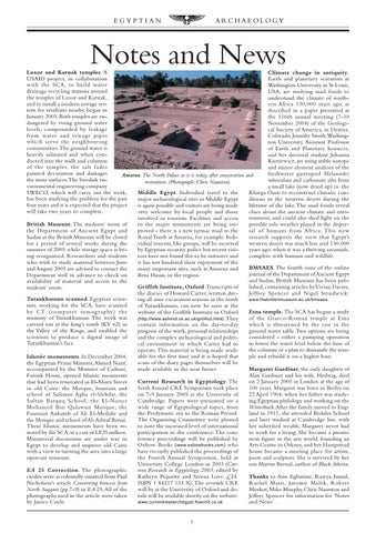Luxor and Karnak temples. A Climate change in antiquity. USAID project, in collaboration Earth and planetary scientists at with the SCA, to build water Washington University in St Louis, drainage recycling stations around USA, are studying snail fossils to the temples of Luxor and Karnak, understand the climate of northand to install a modern sewage sysern Africa 130,000 years ago, as tem for residents nearby, began in described in a paper presented at January 2005. Both temples are enthe 116th annual meeting (7-10 dangered by rising ground water November 2004) of the Geologilevels, compounded by leakage cal Society of America, in Denver, from water and sewage pipes Colorado. Jennifer Smith,Washingwhich serve the neighbour ing ton University Assistant Professor communities. The ground water is of Earth and Planetary Sciences, heavily salinated and when conand her doctoral student Johanna ducted into the walls and columns Kieniewicz, are using stable isotope of the temples, the salt f ades and minor element analyses of the painted decoration and damages freshwater gastropod Melanoides Amarna. The North Palace as it is today, after conservation and the stone surfaces.The Swedish entuberculata and carbonate silts from restoration. (Photograph: Chris Naunton) vironmental engineering company a small lake (now dried up) in the SWECO, which will carry out the work, Kharga Oasis to reconstruct climatic conMiddle Egypt. Individual travel to the has been studying the problem for the past ditions in the western desert during the major archaeological sites in Middle Egypt four years and it is expected that the project is again possible and visitors are being made lifetime of the lake. The snail fossils reveal will take two years to complete. clues about the ancient climate and envivery welcome by local people and those ronment, and could also shed light on the involved in tourism. Facilities and access to the major monuments are being impossible role weather played in the disperBritish Museum. The students’ room of sal of humans from Afr ica. This new proved - there is a new tarmac road to the the Department of Ancient Egypt and research supports the view that Egypt’s Royal Tomb at Amarna, for example. IndiSudan at the British Museum will be closed vidual tourists, like groups, will be escorted western desert was much less arid 130,000 for a period of several weeks during the years ago, when it was a thriving savannah, by Egyptian security police but recent visisummer of 2005 while storage space is becomplete with humans and wildlife. tors have not found this to be intrusive and ing reorganised. Researchers and students it has not hindered their enjoyment of the who wish to study material between June BMSAES. The fourth issue of the online many important sites, such as Amarna and and August 2005 are advised to contact the journal of the Department of Ancient Egypt Beni Hasan, in the region. Department well in advance to check on and Sudan, British Museum has been pubavailability of material and access to the lished, containing articles by Vivian Davies, Griffith Institute, Oxford. Transcripts of students’ room. Jeffrey Spencer and Nigel Strudwick: the diaries of Howard Carter, written durTutankhamun scanned. Egyptian sciening all nine excavation seasons in the tomb www.thebritishmuseum.ac.uk/bmsaes tists, working for the SCA, have scanned of Tutankhamun, can now be seen at the by CT (computer tomog raphy) the Esna temple. The SCA has begun a study website of the Griffith Institute in Oxford mummy of Tutankhamun. The work was of the Graeco-Roman temple at Esna (http://www.ashmol.ox.ac.uk/gri/4tut.html). They carried out at the king’s tomb (KV 62) in which is threatened by the r ise in the contain information on the day-to-day the Valley of the Kings, and enabled the ground water table. Two options are being progress of the work, personal relationships scientists to produce a digital image of considered - either a pumping operation and the complex archaeological and politiTutankhamun’s face. to lower the water level below the base of cal environment in which Carter had to the columns or a plan to dismantle the temoperate. This material is being made availple and rebuild it on a higher base. able for the first time and it is hoped that Islamic monuments. In December 2004, scans of the diary pages themselves will be the Egyptian Prime Minister, Ahmed Nazif, made available in the near future. Margaret Gardiner, the only daughter of accompanied by the Minister of Culture, Alan Gardiner and his wife, Hedwig, died Farouk Hosni, opened Islamic monments on 2 January 2005 in London at the age of Current Research in Egyptology. The that had been renovated in El-Muez Street 100 years. Margaret was born in Berlin on Sixth Annual CRE Symposium took place in old Cairo: the Mosque, fountain and 22 April 1904, when her father was studyon 7-9 January 2005 at the University of school of Suliman Agha el-Slehdar, the ing Egyptian philology and working on the Cambridge. Papers were presented on a Sultan Barquq School, the El-Nasser Wörterbuch. After the family moved to Engwide range of Egyptological topics, from Mohamed Bin Qalawun Mosque, the land in 1911, she attended Bedales School the Predynastic era to the Roman Period. Fountain Ankuteb of Ali El-Metlahr and and later studied at Cambridge but, with The Organising Committee were pleased the Mosque and school of Al-Ashraf Bersai. her inherited wealth, Margaret never had to note the increased level of international These Islamic monuments have been reto work for a living. She became a promiparticipation in the conference. The constored by the SCA, at a cost of LE25 million. nent figure in the arts world, founding an ference proceedings will be published by Ministerial discussions are under way in Arts Centre in Orkney, and her Hampstead Oxbow Books ( www.oxbowbooks.com) who Egypt to develop and improve old Cairo have recently published the proceedings of home