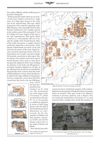 the mother of Khufu, and the satellite/queen’s pyramid of Radjedef. 3'324'900 At this period (for tombs which are not rock0 8 cut) the inner chapel is restricted to a single 6 15 room of L-shape plan, located at the south 28 11 14 end of the superstructure. This type, which 13 2 27 dominated at Giza until the beginning of the (!+?BD: 26 Fifth Dynasty, is also repeatedly found at Abu 4 7 25 3 Rawash. Furthermore, two mastabas situated 3'324'800 1 19 17 in the northern part of the necropolis, F7 and 12 5 9 F19, display two stone chapels of this type in 21 the same superstructure. This layout, which 10 is known as a ‘twin-mastaba’, fell out of use %'*'/'-2 4(9 34 after the middle of the Fourth Dynasty. Most 40 of the tombs also possess a complex exterior 36 32 42 35 mud-brick chapel that is characteristic of this 38 dynasty. Unfortunately not much can be said 41 43 51 about the decoration of the stone chapels be44 cause of intense quarrying activity at the site. 37 45 46 30 Nonetheless, the recently excavated mastaba 31 F 39 5BB F48 provides crucial data in this respect.The ,E D > 6;8 (!.?ED: 33 decoration of its southern niche shows typical $> 47 48 Fourth Dynasty criteria such as a linen list in XV the panel, the depiction of the owner holding XIV his staff close to the body and offering-bearIX 49 ers/family members displayed on all sides of the offering-niche.An almost exact parallel for this particular niche is known from the tomb of Nyhetepkhnum at Giza, which should now 50 40 be dated to the reign of Khufu or thereabouts, based on comparative criteria from F48.Thus 3'324'500 a much later date (such as the late Old Kingdom which &299276 -/$+7; '*<*,1 "!!# has been pro0 Map of Cemetery ‘F’ and its two groups of mastabas posed by some cemetery has been clarified, the question of the relationscholars) can be ruled ) #(!*,.-+ ship between the pyramid of Radjedef and the necropolis, out. The monumental which are situated 1.5km apart, needs to be addressed. size of the largest tombs Contrary to previous opinions, such a distance does of Cemetery ‘F’, which not exclude the identification of Cemetery ‘F’ as a royal are about 50m Z 25m (see cemetery. Other examples show clearly that members of F7, 13, 19, 37), provides an additional argument ) $& in favour of their being dated to the first half of the Fourth Dynasty. Such dimensions are characteristic for the elite ) %" mastabas at Dahshur and Giza (nucleus cemeteries G1200 and G2100) dating respectively to the reigns of Snofru and ) %' Khufu. Now that the date of the #