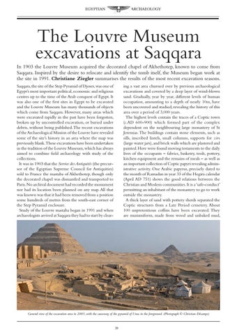 In 1903 the Louvre Museum acquired the decorated chapel of Akhethotep, known to come from Saqqara. Inspired by the desire to relocate and identify the tomb itself, the Museum began work at the site in 1991. Christiane Ziegler summarises the results of the most recent excavation seasons. Saqqara,the site of the Step Pyramid of Djoser,was one of Egypt’s most important political, economic and religious centres up to the time of the Arab conquest of Egypt. It was also one of the first sites in Egypt to be excavated and the Louvre Museum has many thousands of objects which come from Saqqara. However, many areas which were excavated rapidly in the past have been forgotten, broken up by uncontrolled excavation, or buried under debris, without being published.The recent excavations of the Archaeological Mission of the Louvre have revealed some of the site’s history in an area where the map was previously blank.These excavations have been undertaken in the tradition of the Louvre Museum, which has always aimed to combine field archaeology with study of the collections. It was in 1903 that the Service des Antiquités (the precursor of the Egyptian Supreme Council for Antiquities) sold to France the mastaba of Akhethotep, though only the decorated chapel was dismantled and transported to Paris.No archival document had recorded the monument nor had its location been planned on any map. All that was known was that it had been removed from a position some hundreds of metres from the south-east corner of the Step Pyramid enclosure. Study of the Louvre mastaba began in 1991 and when archaeologists arrived at Saqqara they had to start by clear-