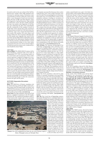 of a tripartite sanctuary.Two limestone door sockets indicated that some of the temple doorways were over 2m wide.Two joining fragments of a limestone door-jamb were re-excavated from in front of the antiquities resthouse, revealing an inscription of Ramesses II, with evidence of later recarving. Following the identification of a fortified enclosure wall through geophysical survey in 2004, excavation of its N corner confirmed the presence of a 5m thick mud-brick wall with an exterior tower or bastion. The ceramics from the area indicate a Ramesside date.Small rooms of theTIP were subsequently built against the partly decayed interior face of the enclosure wall.The magnetometer survey was extended further N, revealing several segments of a substantial wall, presumed to be a later temple enclosure. A programme of recording interviews with local inhabitants was instigated, to find out information on the history of the site (particularly of organised sebakh-removal) in the early and mid-twentieth century, interpretations of the site’s history, and myths associated with it. (www.thebritishmuseum.ac.uk) Tell el-Daba: The Austrian Archaeological Inst Cairo/Inst of Egyptology, Univ of Vienna, team, directed by Manfred Bietak with Irene Forstner Upper Egypt Müller as Deputy Director, continued excavations Deir el-Bahri:The MMA/ARCE mission, led by in the Tuthmoside palatial precinct (see EA 26, Elena Pischikova, continued work at the tomb of pp.13-17). E of the major Palace G a large public Nespakashuty (TT 312), concentrating mostly on building was partly unearthed covering more than the conservation and reconstruction of the tomb’s 2,500m2. It was equipped with a bathroom and a entrance gateway. Completed in August, the reconhuge public hall. In the debris further Minoan wall structed gate is 5.6m high and 3.25m wide with paintings and plaster reliefs were found.They seem almost 200 sandstone fragments of the collapsed gate, to originate from Palace G and had been dumped found during the previous seasons,incorporated into on the debris of the public building. On top of this the reconstruction.The size and proportions of the building a Ramesside cemetery with simple pit buristructure were governed by surviving sections of als and a few slipper coffins was found.The burials such architectural elements as doorframes, cavetto had almost no offerings. The population seems to cornice, torus moulding,lintel, window, and lunette. have been of extremely small stature even by ancient These were complemented by new sandstone blocks Egyptian standards - this may reflect a shortage of which re-create the general outlines of the missing food and contrasts with the eulogies about Piramesse elements.The now mostly ruined mud-brick pylon in P. Anastasi II and III. that once stood 8m high surrounding the entrance Giza: The SCA expedition, directed by Zahi structure was partially reconstructed as a broken line Hawass, is currently excavating in two areas.Work of bricks framing the gate to show the connection continues in the tombs of the pyramid builders, and between the gate and the pylon. on the S side of the cemetery,especially in the Upper Cemetery. In addition, shafts were opened in tombs AUTUMN (September-December) in the Lower Cemetery. Excavation also continued Lower Egypt behind the Sphinx and the Second Pyramid in the Buto: The DAI/Univ of Poitiers expedition, led region of Campbell’s Tomb and the Osiris Shaft: by Ulrich Hartung and Pascale Ballet, undertook a this area was used for burials in the 26th Dyn, when short study season focusing mainly on pottery and Khufu’s cult was revived.Three tombs cut into the small finds from previous excavations by the Univ of rock were discovered. One tomb has a shaft which Poitiers team (see EA 24,pp.18-19),of early Roman descends to 7m, at which level there are six rooms pottery kilns at the N slope. (www.dainst.org) cut into the rock.In one of them was found a woodKom Firin:The BM expedition, directed by Neal en box containing c.400 shabtis. (www.guardians.net/ Spencer, completed excavations in the SE temple, hawass) (Ramesses II).The mud-brick foundation walls alAbu Sir: The Czech Inst of Egyptology mission, lowed much of the temple’s plan to be recovered: directed by Miroslav Verner, concluded exploration a columned hall preceded a transverse hall, in front of a 3rd Dyn mud-brick mastaba E of Hetepi’s tomb. The ground plan of this N-S oriented mastaba measures c.52m x 26m and traces of the chapel, originally embedded within the superstructure’s masonry, were located in the SE corner of the mastaba.Approximately in the centre of the mastaba an entrance leads to the substructure,15m below the present surface, which has a very unusual U-shaped plan with several short corridors (probably storerooms) running both to the E andW where the burial chamber is located.The tomb had been completely looted in antiquity and only numerous fragments of stone vessels remained from the Armant.View of the underground level below the naos of the Ptolemaic temple of original burial. It was reused in the LP when over 40 secMontu. Photograph courtesy of Christophe Thiers