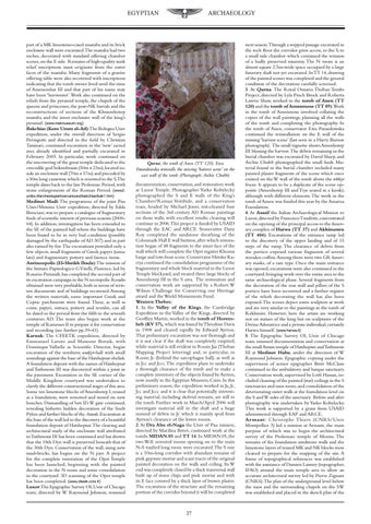 next season.Through a stepped passage excavated in the rock floor the corridor gives access, to the S, to a small side chamber which contained the remains of a badly preserved mummy. The N room is an almost square 2.5m-wide space occupied by a large funerary shaft not yet excavated. In TT 14, drawing of the painted scenes was completed and the general condition of the decoration carefully screened. 3. At Qurna The Royal Ontario Theban Tombs Project, directed by Lyla Pinch Brock and Roberta Lawrie Shaw, worked in the tomb of Anen (TT 120) and the tomb of Amenmose (TT 89).Work in the tomb of Amenmose involved collating the copies of the wall paintings, planning all the walls of the tomb and completing the photography. In the tomb of Anen, conservator Ewa Parandowska continued the reinstallation on the E wall of the missing ‘harvest scene’ (last seen in a Harry Burton photograph). The small vignette shows Amenhotep III blessing the harvest.The debris remaining in the burial chamber was excavated by David Sharp, and Archie Chubb photographed the small finds. Material found in the burial chamber included many painted plaster fragments of the scene which once existed on the W wall of the tomb above the rekhyt frieze. It appears to be a duplicate of the scene opposite (Amenhotep III and Tiye seated in a kiosk), although with different elements.The work in the tomb of Amen was funded this year by the Amarna Foundation. 4. At Asasif the Italian Archaeological Mission to Luxor,directed by FrancescoTiradritti,concentrated on the opening of the principal access to the funerary complex of Harwa (TT 37) and Akhimenru (TT 404). Excavations of the entrance ramp led to the discovery of the upper landing and of 15 steps of the ramp. The clearance of debris from the portico exposed various fragments of several wooden coffins.Among them were two GR funerary masks, of a rare type. Once the main entrance was opened, excavations were also continued in the courtyard, bringing work over the entire area to the same archaeological phase. Several fragments from the decoration of the rear wall and pillars of the S portico have been recovered and a further register of the reliefs decorating the wall has also been exposed.The scenes depict some sculptors at work and are very similar to the paintings in the tomb of Rekhmire. However, here the artists are working not on statues of the king but on sculptures of the Divine Adoratrice and a private individual, certainly Harwa himself. (www.harwa.it) 5. The Epigraphic Survey OI, Univ of Chicago team resumed documentation and conservation at the small Amun temple of Hatshepsut andTuthmosis III at Medinet Habu, under the direction of W Raymond Johnson. Epigraphic copying under the supervision of senior epigrapher Brett McClain continued in the ambulatory and barque sanctuary. Conservation work, supervised by Lotfi Hassan, included cleaning of the painted (star) ceilings in the S sanctuaries and naos room, and consolidation of the deteriorating outer walls at the foundation level on the S and W sides of the sanctuary. Before and after photography was undertaken by Yarko Kobylecky. This work is supported by a grant from USAID administered through EAP and ARCE. Ar mant: Chr istophe Thiers (CNRS/Univ Montpellier 3) led a mission at Armant, the main purpose of which was to begin the architectural survey of the Ptolemaic temple of Montu. The remains of the foundation sandstone walls and the limestone layers of reused MK and NK blocks were cleaned to prepare for the mapping of the site. A frame of topographical references was established with the assistance of Damien Laisney (topographer, IFAO) around the main temple area to allow an accurate architectural survey led by Pierre Zignani (CNRS).The plan of the underground level below the naos and the surrounding chapels on the SW was established and placed in the sketch plan of the