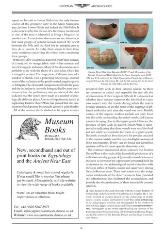 preserved fatty acids in their ceramic matrix. As these are common in animal and vegetable fats and oils, the determination of their origin is difficult. It is also unclear whether these residues represent the first food to come into contact with the vessels, during which the matrix became saturated, or are the result of the trapping of different molecules each time the vessel was used. Possible sources of the organic residues include not only food, but also trash surrounding discarded vessels, and human remains decaying close to their grave goods. However, the presence of fatty acids in Eastern Desert Ware is interpreted as indicating that these vessels were used for food and not solely as receptacles for water or as grave goods. Recently a search has been initiated for proteins attached to the ceramic matrix and this may shed light on many of these uncertainties. If they can be found and identified, proteins will be far more specific than fatty acids. The evidence summarised above indicates that Eastern DesertWare is the result of the household production of a utilitarian ware by groups of (pastoral) nomads whenever the need occurred or the opportunity presented itself. Its occurrence in the archaeological record coincides with the large influx of traders, miners and quarrymen during Graeco-Roman times.Their interaction with the indigenous inhabitants of the desert seems to have provided the infrastructure that facilitated the accumulation, and possibly also the production, of these remarkable ceramic artefacts. Ă” Hans Barnard is Research Associate with the Cotsen Institute of Archaeology at the University of California, Los Angeles. He is currently involved in research projects on the archaeology of mobile people, ceramic analysis and Eastern Desert Ware (www.archbase.org). As an archaeological surveyor and photographer he has worked on sites in Chile, Egypt, Iceland, Sudan and Yemen (www.barnard.nl/hans1. html). Photographs by the writer, reproduced (p.29) courtesy of the Kunsthistorisches Museum,Vienna and the Naprstek Museum,Prague. and (p.30) courtesy of the Berenike Project and the Sikait Conservation Project.