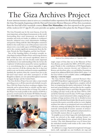 A new internet resource aims to serve as a centralised online repository for all archaeological activity at the Giza Necropolis,beginning with the Harvard University/Boston Museum of Fine Arts excavations from the first half of the twentieth century. Peter Der Manuelian, who first reported on the genesis of the work in EA 17 (pp.25-27), now provides an update and describes plans for the Project’s future. The Giza Pyramids may be the most famous, if not the most important, archaeological monuments in the world. Surrounding these royal monuments are hundreds of mastabas and rock-cut tombs, in addition to workmen’s barracks, industrial areas, royal administrative buildings, and quarries.Along with the other Memphite cemeteries further to the south,Giza is one of the primary sources for almost every conceivable aspect of Old Kingdom society, and it also contains significant monuments from the Archaic Period, the New Kingdom, and the Late Period. Two of the founding fathers of modern scientific archaeological method,Flinders Petrie and George Reisner, both worked at Giza and several expeditions, down to the present day, have over the decades made important contributions to our understanding of the site. In fact, the ‘explosion’of information amassed by various expeditions is so overwhelming that it is almost impossible to gain a clear overview of all the relevant data, for it does not reside in any one location,and much remains unpublished. Similarly, the artefacts, from the coarsest beer jars to the life-sized royal statues and other masterpieces of Old Kingdom sculpture, are now spread throughout museums in Egypt, Europe and the United States. The Giza Archives Project has now taken a step towards providing access to all this material and scholarly research. Since 2000 the Project has been working to digitise Giza materials and to present them to scholars and the interested public over the internet free of charge.The work of the Project was made possible in the autumn of 2000 by a generous award made by the Andrew W Mellon Foundation (www.mellon.org), which recognised that the largest