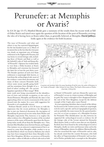 In EA 26 (pp 13-17), Manfred Bietak gave a summary of the results from his recent work at Tell el-Daba/Avaris and raised once again the question of the location of the port of Perunefer, reviving the idea of it having been at Avaris rather than, as generally believed, at Memphis. David Jeffreys looks again at the evidence for both locations. The issue of Perunefer, and what and where it was, has exercised Egyptologists for the last hundred years or so. Much of its interest lies in the fact that the river port was clearly an important area of foreign settlement in the Eighteenth Dynasty, and was home to several foreign cults, including those of Astarte and Baal, as well as the hybrid(?) cults of Seth and Amun-Re ‘of Perunefer’. Opinion has tended lately to veer from a Delta location at Avaris to Memphis, and consensus has favoured the latter for at least the past thirty years. The broader question of such river front settlement is surprisingly little known, at least from the archaeological side: most of the evidence comes from documents, and many of those concern Perunefer itself, whose name means ‘goodly going forth’ A musician and attendants before the young Amenhotep II and his nurse, the mother of Kenamun, in and has sometimes been thought of as a the ‘Garden of Perunefer’. (After Norman de Garis Davies, The Tomb of Ken-amun at Thebes kind of sailors’ sending off - the ancient (New York, 1930) pl.IX) Egyptian equivalent of ‘Bon voyage!’.With or Astarte ‘of Perunefer’, and one (Amun-Re,‘great ram more work now being concentrated on the identificaof Perinefer’) occurs in a letter in praise of Memphis and tion of rivers and riverside occupation, at sites such as its gods.The name is thought to have disappeared before Avaris/Piramesse, Memphis and Karnak, the time is fast the end of the New Kingdom, except for the dubious approaching when we need a reassessment of the state of example of the Coptic place name Panouf. research into the matter. So a new (old) suggestion for It is not surprising, therefore, that so much of the debate Perunefer is of considerable interest. has focused on the written sources, which are surprisingly Professor Bietak’s article in EA 26 leaves us with the rich for such a specific and local topographical question, impression that the recent preference for Memphis is and are probably the main reason for the general preferdue to just one historical document: the inscription of ence for, or at least acceptance of, a Memphite location Amenhotep II, preserved on two stelae from Thebes and for Perunefer. This identification can also, however, be Memphis respectively. This, however, is to neglect the supported the archaeological record as evidence for all other evidence for a Memphite location: of the recorded the foreign cults of the Levant attested for Perunefer instances of the name of Perunefer apart from the Amen(Baal,Astarte, Seth), as well as some that are not (Qadesh, hotep stelae, nearly all are from the Memphis area - Tura, Reshef), have been found in the archaeological record at Zawiyet Abu Musallam (near Zawiyet Aryan),and Saqqara. Memphis, chiefly on votive and funerary stelae and in the One instance on an ostracon is unprovenanced but is asnames of Memphite citizens.In addition,Mariam Kamish, sumed to come from Memphis, while another is on an who has researched the topic of Perunefer and its cults, inscribed block which was found at Bubastis, but which has already noted that the courtier Kenamun, who held may have been transported there from Memphis in the the office of ‘Superintendant of Perunefer’ and was burlater New Kingdom. All these occurrences of Perunefer ied at Thebes, probably had a cenotaph in the Memphite are in titles – either of officials or of local cults such as Seth 36