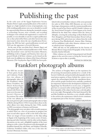 lished with several further volumes of the series promised for early in 2006. Other EES Memoirs are now in the final stages of preparation, with the imminent publication of the second of Sue Davies and H S Smith’s volumes on the Sacred Animal Necropolis at North Saqqara, to be closely followed by the third. Two volumes from the Survey of Memphis, covering the archaeology at Kom Rabia in the New Kingdom and Third Intermediate Period will appear during 2006 and at least one volume from the work at Amarna, Fran Weatherhead’s Amarna Palace Paintings, will be published, with other Amarna volumes now in an advanced state of preparation. 2006 will also see the publication by the Society of Brenda Moon’s long-awaited biography of the Society’s founder,Amelia Edwards. Other volumes are actively being prepared and should appear in the next few years, to bring the Society’s publications as up-to-date as possible. PATRICIA SPENCER