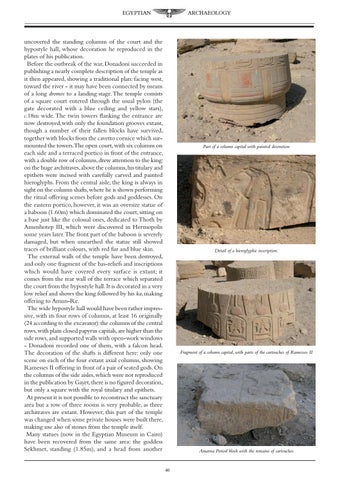 uncovered the standing columns of the court and the hypostyle hall, whose decoration he reproduced in the plates of his publication. Before the outbreak of the war, Donadoni succeeded in publishing a nearly complete description of the temple as it then appeared, showing a traditional plan: facing west, toward the river - it may have been connected by means of a long dromos to a landing stage. The temple consists of a square court entered through the usual pylon (the gate decorated with a blue ceiling and yellow stars), c.18m wide. The twin towers flanking the entrance are now destroyed,with only the foundation grooves extant, though a number of their fallen blocks have survived, together with blocks from the cavetto cornice which surmounted the towers.The open court,with six columns on each side and a terraced portico in front of the entrance, with a double row of columns,drew attention to the king: on the huge architraves,above the columns,his titulary and epithets were incised with carefully carved and painted hieroglyphs. From the central aisle, the king is always in sight on the column shafts,where he is shown performing the ritual offering scenes before gods and goddesses. On the eastern portico, however, it was an oversize statue of a baboon (1.60m) which dominated the court, sitting on a base just like the colossal ones, dedicated to Thoth by Amenhotep III, which were discovered in Hermopolis some years later.The front part of the baboon is severely damaged, but when unearthed the statue still showed traces of brilliant colours, with red fur and blue skin. The external walls of the temple have been destroyed, and only one fragment of the bas-reliefs and inscriptions which would have covered every surface is extant; it comes from the rear wall of the terrace which separated the court from the hypostyle hall. It is decorated in a very low relief and shows the king followed by his ka, making offering to Amun-Re. The wide hypostyle hall would have been rather impressive, with its four rows of columns, at least 16 originally (24 according to the excavator):the columns of the central rows,with plain closed papyrus capitals,are higher than the side rows, and supported walls with open-work windows - Donadoni recorded one of them, with a falcon head. The decoration of the shafts is different here: only one scene on each of the four extant axial columns, showing Ramesses II offering in front of a pair of seated gods. On the columns of the side aisles, which were not reproduced in the publication by Gayet,there is no figured decoration, but only a square with the royal titulary and epithets. At present it is not possible to reconstruct the sanctuary area but a row of three rooms is very probable, as three architraves are extant. However, this part of the temple was changed when some private houses were built there, making use also of stones from the temple itself. Many statues (now in the Egyptian Museum in Cairo) have been recovered from the same area: the goddess Sekhmet, standing (1.85m), and a head from another