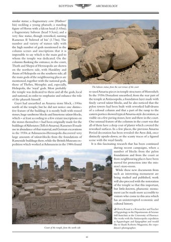 similar statue; a fragmentary cow (Hathor/ Isis) suckling a young pharaoh; a standing figure of Horus with a falcon head (1.65m); a fragmentary baboon (head 9.5cm); and a very fine statue, though reworked, naming Ramesses II ‘beloved of Isis’ (1.73m). The number and variety of statues tally with the high number of gods mentioned in the column scenes and inscriptions that it is impossible to say which is the main god to whom the temple was dedicated. On the columns flanking the entrance, in the court, Thoth and Shepsi of Hermopolis are shown on the northern side, with Harakhty and Atum of Heliopolis on the southern side; all the main gods of the neighbouring places are mentioned, together with the national gods, those of Thebes, Memphis and, especially, Heliopolis, the ‘royal’ gods. Most probably the temple was dedicated to them and all the gods, local and national, in order to emphasise and enhance the role of the pharaoh himself. Gayet had unearthed an Amarna stone block, c.100m north of the temple; but he did not notice one distinctive feature of the building: it is mostly built with reused stones,huge sandstone blocks and limestone talatat-blocks, which – at least according to a few extant inscriptions on the stones themselves – had been originally made for the buildings of Akhetaten (Tell el-Amarna).Ramesses II made use in abundance of that material,and German excavations in the 1930s at Ashmunein-Hermopolis discovered very large amounts of talatat-blocks from the foundations of Ramesside buildings there,while the British Museum expedition which worked at Ashmunein in the 1980s found
