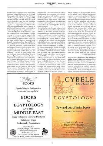 Yet, the substance of the argument is there, in another of those acts of revelation that Assmann performs on such writing:‘chapter 172’ turns out to belong to a world of‘deification of limbs’ that crosses from the laments of Isis to the love songs of the New Kingdom, and somehow enters the Bible as the ‘Song of Songs’. So we move from ‘chapter 172’: ‘your lashes last forever, your eyelids are of fast lapis blue’ to Solomon: ‘your eyes are doves behind your veil, your hair like a herd of goats descending Gilead’s slopes’. Here, we discover why we need Assmann for these writings, even if we may argue with him over the ‘truth’ of his very philological view of Egypt. We must not put away our books on burial customs, or forget the archaeology that can tell us more - for example, it is the pottery repertoire which will tell us whether they used ‘Letter to the Dead’ plates for offering water (so Assmann, p.161) or food, as seems more practical.Yet we have to come back to this book and others if we are to find our way through the extraordinary visual and written world that the Egyptians STEPHEN QUIRKE Robyn Gillam, Performance and Drama in Ancient Egypt. Duckworth Publishing, 2005. (ISBN 0 7156 3404 6). Price: £16.99. In the ‘Introduction’ to this unusual book, Dr Gillam notes the present-day blurring of distinctions between archaeology, ‘a scholarly, scientific pursuit’ and performance, as seen in television documentaries about ancient Egypt which feature ‘imaginative (some may well say over-
