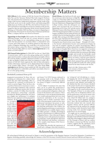 EES Officers. In the autumn of 2005 the Society’s Vice-Chairman, John Tait, and the Treasurer, Michael Pike both resigned. Professor Tait, who had been Vice-Chairman since 2001, had been in overall charge of the Society’s publications programme and the results of his hard work can be seen in the number of new and forthcoming EES publications (see further p.2). Mr Pike, who had been Treasurer since 2003 and had been responsible for several new initiatives at the Society, resigned to take up a post in Mauritius.At the Society’s Annual General Meeting on 3 December 2005, Ian Shaw, a Lecturer in Egyptology at the University of Liverpool was elected asVice-Chairman and Stewart White, a company director, was elected as Treasurer. Egyptology in East Anglia. EES member, Dee Mason, has sent the following message: ‘Given the lack of a society devoted to ancient Egypt in East Anglia, we are contemplating setting one up in Norwich. Our first priority is to ascertain if there is a demand for such a society and in this respect we would be pleased to hear from any readers of Egyptian Archaeology who would like to be involved. In the first instance, please contact Dee Mason in writing at 31 Caernarvon Road, Norwich NR2 3HZ, by email at deebunce@hotmail.com or by phone on 01603 628570’.