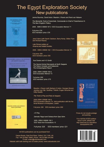 Jane Faiers (with Sarah Clackson, Barry Kemp, Gillian Pyke and Richard Reece) Late Roman pottery at Amarna and related studies. 2005. ISBN 0 85698 162 1 EES Excavation Memoir 72 Full price: £60 EES members' price: £50 Sue Davies and H S Smith The Sacred Animal Necropolis at North Saqqara. The Falcon Complex and Catacomb. The Archaeological Report. 2005. ISBN 0 85698 165 6. EES Excavation Memoir 73 Full price: £90 EES members' price: £75