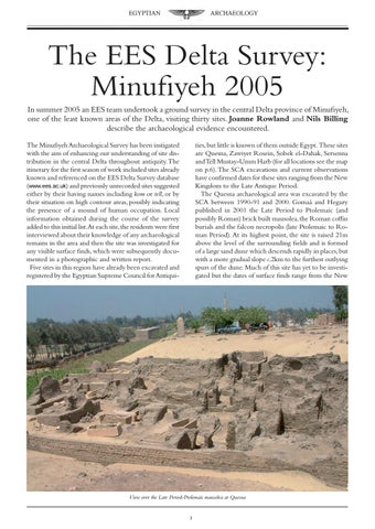 In summer 2005 an EES team undertook a ground survey in the central Delta province of Minufiyeh, one of the least known areas of the Delta, visiting thirty sites. Joanne Rowland and Nils Billing describe the archaeological evidence encountered. The Minufiyeh Archaeological Survey has been instigated with the aim of enhancing our understanding of site distribution in the central Delta throughout antiquity.The itinerary for the first season of work included sites already known and referenced on the EES Delta Survey database (www.ees.ac.uk) and previously unrecorded sites suggested either by their having names including kom or tell, or by their situation on high contour areas, possibly indicating the presence of a mound of human occupation. Local information obtained during the course of the survey added to this initial list.At each site,the residents were first interviewed about their knowledge of any archaeological remains in the area and then the site was investigated for any visible surface finds, which were subsequently documented in a photographic and written report. Five sites in this region have already been excavated and registered by the Egyptian Supreme Council for Antiqui-