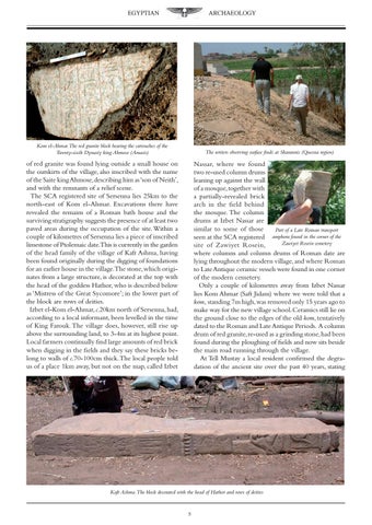 of red granite was found lying outside a small house on the outskirts of the village, also inscribed with the name of the Saite king Ahmose,describing him as‘son of Neith’, and with the remnants of a relief scene. The SCA registered site of Sersenna lies 25km to the north-east of Kom el-Ahmar. Excavations there have revealed the remains of a Roman bath house and the surviving stratigraphy suggests the presence of at least two paved areas during the occupation of the site. Within a couple of kilometres of Sersenna lies a piece of inscribed limestone of Ptolemaic date.This is currently in the garden of the head family of the village of Kafr Ashma, having been found originally during the digging of foundations for an earlier house in the village.The stone, which originates from a large structure, is decorated at the top with the head of the goddess Hathor, who is described below as ‘Mistress of the Great Sycomore’; in the lower part of the block are rows of deities. Izbet el-Kom el-Ahmar, c.20km north of Sersenna, had, according to a local informant, been levelled in the time of King Farouk. The village does, however, still rise up above the surrounding land, to 3-4m at its highest point. Local farmers continually find large amounts of red brick when digging in the fields and they say these bricks belong to walls of c.70-100cm thick.The local people told us of a place 1km away, but not on the map, called Izbet