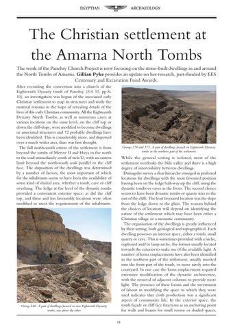 The Christian settlement at the Amarna North Tombs The work of the Panehsy Church Project is now focusing on the stone-built dwellings in and around the North Tombs of Amarna. Gillian Pyke provides an update on her research, part-funded by EES Centenary and Excavation Fund Awards. After recording the conversion into a church of the Eighteenth Dynasty tomb of Panehsy (EA 32, pp.810), an investigation was begun of the associated early Christian settlement to map its structures and study the material remains in the hope of revealing details of the lives of this early Christian community. All the Eighteenth Dynasty North Tombs, as well as numerous caves at various locations on the same level, on the cliff top or down the cliff-slope, were modified to become dwellings or associated structures and 72 probable dwellings have been identified. This is considerably more, and dispersed over a much wider area, than was first thought. The full north-south extent of the settlement is from beyond the tombs of Meryre II and Huya in the north to the wadi immediately south of stela U, with an eastern limit beyond the north-south wadi parallel to the cliff face. The disposition of the dwellings was determined by a number of factors, the most important of which for the inhabitants seems to have been the availability of some kind of shaded area, whether a tomb, cave or cliff overhang. The ledge at the level of the dynastic tombs provided a convenient exterior space, as did the cliff top, and these and less favourable locations were often modified to meet the requirements of the inhabitants.